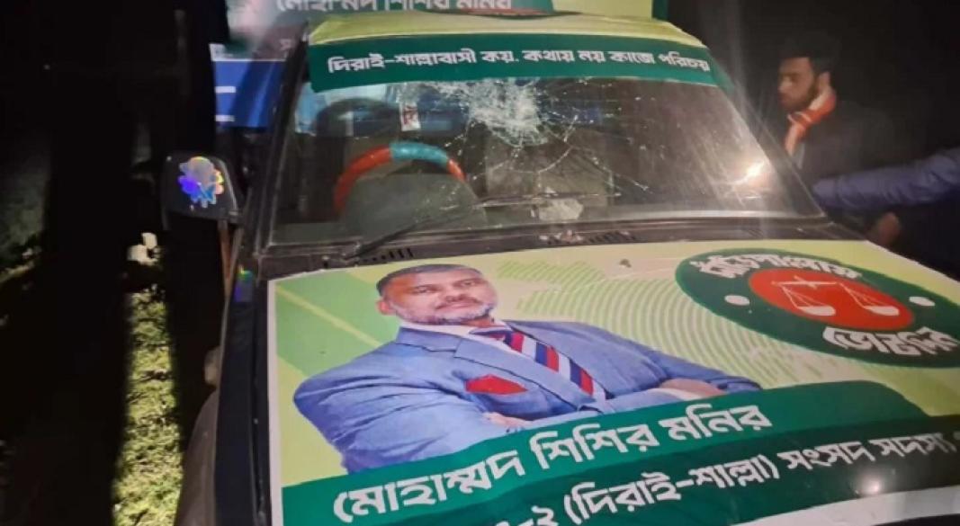 সুনামগঞ্জের দিরাই উপজেলায় বাংলাদেশ জামায়াতে ইসলামীর মনোনীত প্রার্থী অ্যাডভোকেট শিশির মনিরের নির্বাচনী প্রচার গাড়িতে হামলা ও ভাঙচুরের ঘটনা ঘটেছে বলে অভিযোগ পাওয়া গেছে। বৃহস্পতিবার সন্ধ্যায় উপজেলার কাদিরপুর এলাকায় এ হামলার ঘটনা ঘটে।