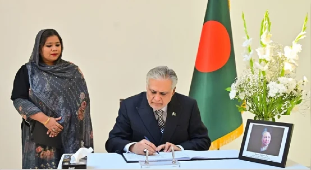 ইসলামাবাদের বাংলাদেশ হাইকমিশনে গিয়ে সাবেক প্রধানমন্ত্রী খালেদা জিয়ার প্রয়াণে শোক জানিয়েছেন পাকিস্তানের পররাষ্ট্রমন্ত্রী ইসহাক দার।